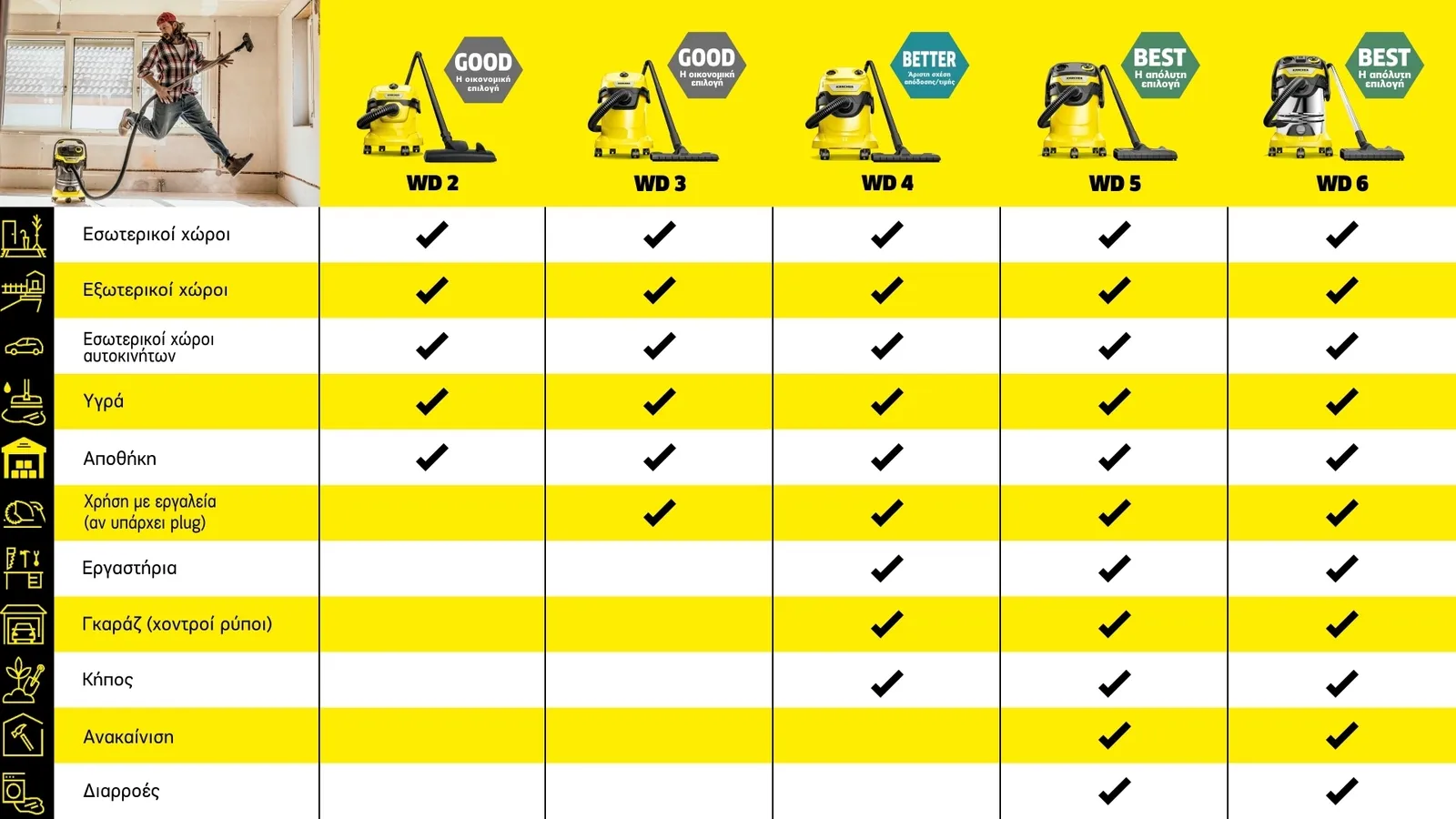 WD = σκούπα υγρής και ξηρής αναρρόφησης με κίτρινο περίβλημα