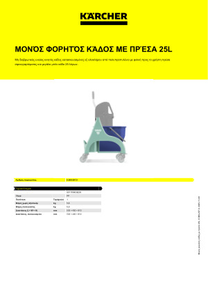 Το καρότσι μας με τροχούς 80 mm και ενσωματωμένους προστατευτικούς προφυλακτήρες εγγυάται εξαιρετική κινητικότητα στις εφαρμογές καθαρισμού. Ο ενιαίος κινητός κάδος με φιλική προς το χρήστη πρέσα σφουγγαρίσματος και μπλε κάδο 25 λίτρων είναι κατασκευασμένος εξ ολοκλήρου από πολυπροπυλένιο και επομένως είναι πολύ υγιεινός στον καθαρισμό και μπορεί να ανακυκλωθεί. Το μονοκόμματο πλαίσιο βάσης εξασφαλίζει χαμηλό βάρος και μέγιστη στιβαρότητα.