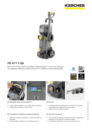 Το HD 4/11 C Bp Battery είναι το πρώτο μπαταριοκίνητο μηχάνημα καθαρισμού υψηλής πίεσης που είναι κατάλληλο για επαγγελματικές εφαρμογές. Μπορεί να χρησιμοποιηθεί είτε κάθετα είτε οριζόντια, ενώ παράλληλα εντυπωσιάζει με το εύρος των χαρακτηριστικών εξοπλισμού υψηλής ποιότητας που διαθέτει, όπως η κυλινδρική κεφαλή από ορείχαλκο, ο αυτόματος μηχανισμός εκτόνωσης πίεσης και ο έξυπνος χώρος αποθήκευσης αξεσουάρ. Επίσης, η συσκευή διαθέτει τα εξής: το πιστόλι υψηλής πίεσης EASY!Force χρησιμοποιεί τη δύναμη επαναφοράς του πίδακα υψηλής πίεσης για να μηδενίσει τη δύναμη συγκράτησης που πρέπει να ασκεί ο χρήστης, ενώ οι ταχυσύνδεσμοι EASY!Lock επιτρέπουν έως και 5 φορές ταχύτερο χειρισμό σε σχέση με τις συμβατικές κοχλιωτές συνδέσεις χωρίς συμβιβασμούς όσον αφορά την ανθεκτικότητα ή τη μεγάλη διάρκεια ζωής. Το μηχάνημα είναι ιδανικό για επιστάτες, εργασίες εξωραϊσμού ή χρήση σε δήμους και λειτουργεί με 2 ισχυρές μπαταρίες ιόντων-λιθίου 36V, οι οποίες δεν περιλαμβάνονται στα παραδοτέα. Οι μπαταρίες της πλατφόρμας μπαταριών 36 V είναι συμβατές με άλλα μηχανήματα της ίδιας σειράς και εγγυώνται μεγάλες περιόδους λειτουργίας και εξαιρετικά αποτελέσματα καθαρισμού. Για ηπιότερους ρύπους, συνιστάται η χρήση της λειτουργίας eco!efficiency προκειμένου να παραταθεί ο χρόνος λειτουργίας της μπαταρίας έως και 34 λεπτά.