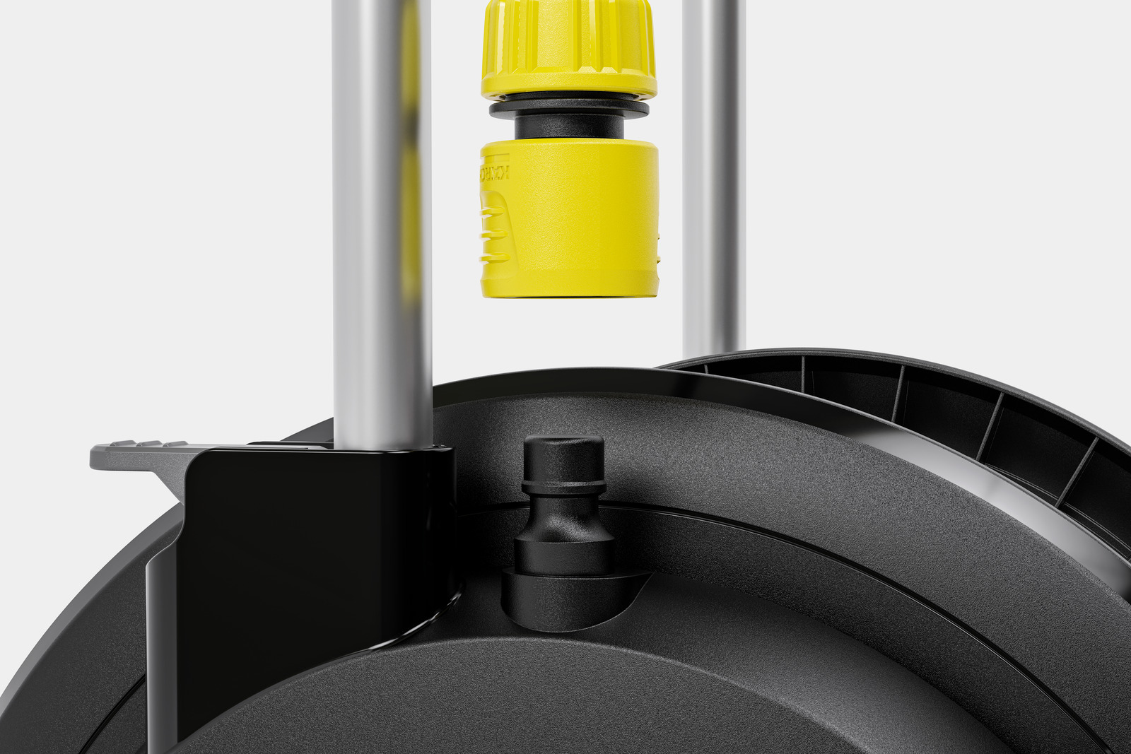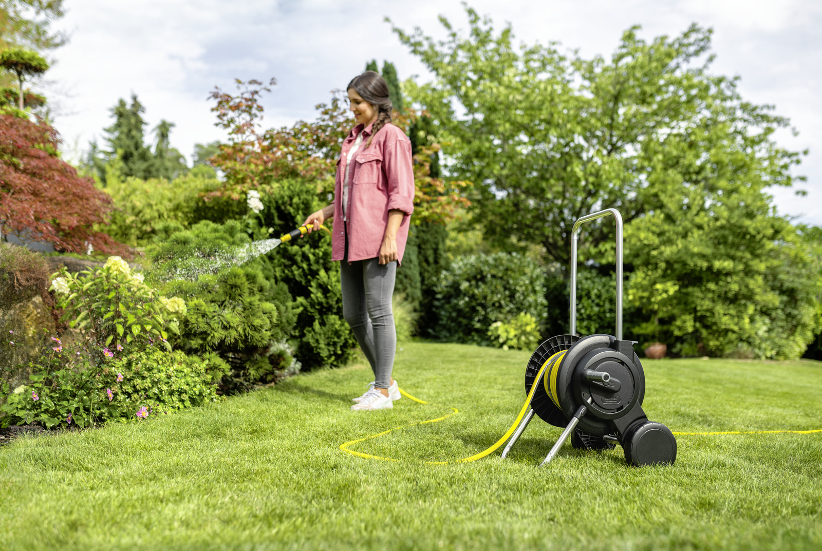 Το συμπαγές και κινητό καρότσι λάστιχου με εξαιρετικά φαρδιά βάση για μέγιστη σταθερότητα, σωλήνα Kärcher 20 m, εξαρτήματα ποτίσματος και ακροφύσιο, καθώς και ρυθμιζόμενη σε ύψος λαβή.