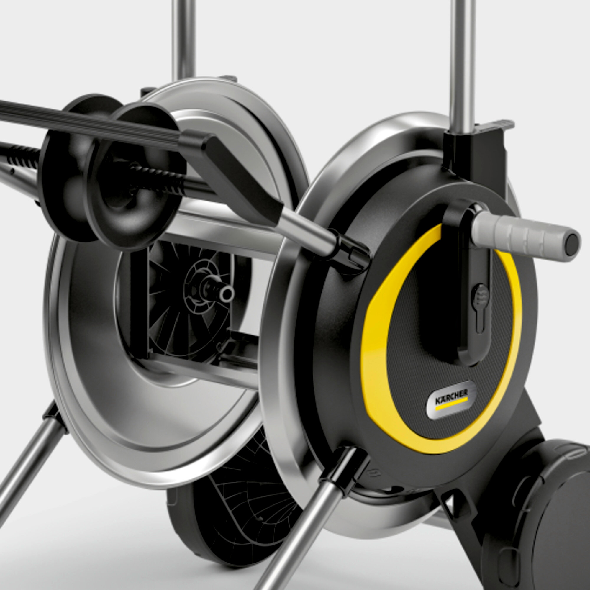Το κινητό και σταθερό καρότσι λάστιχου εντυπωσιάζει με μια ανθεκτική μεταλλική ανέμη σωλήνα, εξαιρετικά φαρδιά βάση, ακριβή οδηγό σωλήνα και ρυθμιζόμενη σε ύψος λαβή.