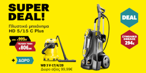 Απόκτησε τώρα το επαγγελματικό μηχάνημα υψηλής πίεσης κρύου νερού HD 5/15 C Plus μόνο 806,00€ και δώρο μια σκούπα WD 3 V-17/4/20 αξίας 99,99€!