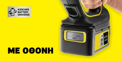 Φαντάσου να έχεις τη δύναμη της Kärcher στα χέρια σου όπου και αν βρίσκεσαι. Τώρα μπορείς! Η νέα, προηγμένη μπαταρία της Kärcher ήρθε από το μέλλον και αλλάζει όλα όσα ήξερες για τα μπαταριοκίνητα μηχανήματα.