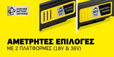 Η Kärcher καινοτομεί δίνοντάς σου αμέτρητες επιλογές με 2 πλατφόρμες (18V & 36V) και πλεονεκτήματα, σε μπαταρίες που είναι συμβατές με μία μεγάλη γκάμα μηχανημάτων, ιδανικές για κάθε ανάγκη αλλά και για αυξημένες απαιτήσεις.